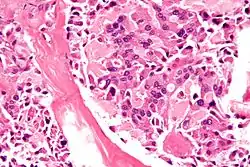 ![]() صورة مجهرية لسرطان درقي نخاعي، كما يرى في تكون الورم الصماوي المتعدد النوع 2 ب، بصبغة الهيماتوكسيلين والأيوزين. صورة مجهرية لسرطان درقي نخاعي، كما يرى في تكون الورم الصماوي المتعدد النوع 2 ب، بصبغة الهيماتوكسيلين والأيوزين. | |