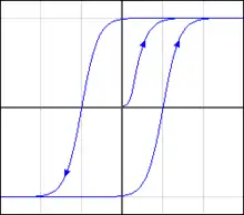 - كما يمكن مغنطة قطعة الحديد إلى التشبع (جزء المنحنى الأفقي). ففي تلك الحالة حيث لا تتغير مغناطيسية القطعة بزيادة المجال الخارجي وتبقى ثابتة، تكون معظم الحبيبات قد وجهت اتجاه مغناطيسيتها في اتجاه المجال الخارجي.