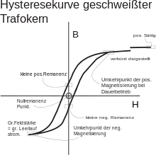 - عندما يؤخذ منحنى المغناطيسية لقطعة الحديد لأول مرة يبدأ المنحنى من مركز الإحداثيات (المنحنى الأزرق) ويسمى هذا المنحنى الابتدائي أو المنحنى الجديد.