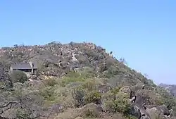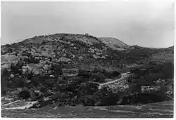 The hills were the scene of the famous indaba between white settlers and Ndebele leaders in 1896—the Second Matabele War, known in Zimbabwe as the First Chimurenga—which ended with the assassination of the Mlimo by فريدريك روسل بورنهام, the American scout, in one of the Matobo caves.[21] Upon learning of the death of the Mlimo, سيسل رودس boldly walked alone and unarmed into this Ndebele stronghold and persuaded the impi to lay down their arms.[22] During the indaba it was also in these hills that بادن باول, the Founder of Scouting, first learned woodcraft, the fundamentals of كشافة, from Burnham.[23][24] Even today, a great deal of the pottery and artefacts found on cave floors and most of the clay grain bins in the hills are remnants from the 1896 rebellion era. There are other reminders too - bronze plaques dotted here and there in various hills mark the sites of armed forts or brief skirmishes.