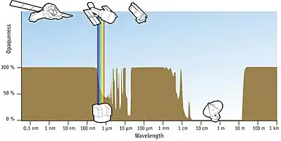 ونستطيع من على سطح الأرض رؤية هذين النطاقين: الضوء المرئي والأشعة الراديوية حيث يقل امتصاص جو الأرض لهما. أما بالنسبة إلى الأشعة السينية وأشعة غاما الآتية من أجرام سماوية فلا بد لرصدها استخدام مِرصَدات خاصة على أقمار صناعية تحملها فوق الغلاف الجوي. وكل من تلك المِرصَدات لهُ تقنيتهُ الخاصة بهِ.