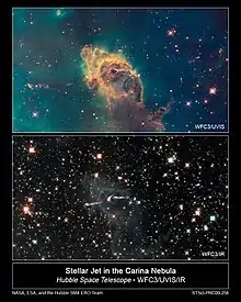 هذه الصورتين في اليسار هي لسديم القاعدة وقد تم التقاطها من قبل مقراب هابل، الصورة بالأعلى تم التقاطها عبر الطيف المرئي المعتاد بينما الصورة في الأسفل تم التقاطها باستخدام معدات للأشعة تحت الحمراء من نفس المقراب هابل، ويلاحظ أن نجوما أكثر تبدو أكثر وضوحاً في الصورة بالأسفل.