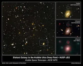 كلما كان الهدف بعيداً كلما بدا لنا عمره أصغر، وذلك بسبب أن الضوء يستغرق وقتاً أطول لكي يبلُغنا، نتيجة لتوسع الكون.