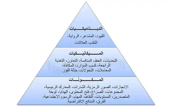 (الديناميكية والميكانيكية والمكونات)، وهذه العناصر منظمة في ترتيب تنازلي من حيث التجريد، حيث أن كل ميكانيكية تنطوي تحت واحدة أو أكثر من الديناميكيات، وكل مكون ينطوي تحت واحد أو أكثر من العناصر ذات المستوى الأعلى ونذكرها مفصلة كالآتي: