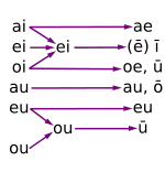 | ae (æ) | saepe, bonae | /aɪ/ /ae/ /ɛ:/ | /ɛ/ | /e/ | /ɛ/ | /ɛ/ | /ɛ/ | /e:/ /ɛ:/ | /ɛ:/ | /eɪ/ /i:/ |