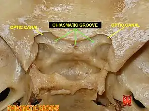 ![]() منظر علوي لقاعدة الجمجمة. العظم الوتدي ملون باللون الأصفر. التلم التصالبي مؤشر في وسط اليسار (Chiasmatic groove). منظر علوي لقاعدة الجمجمة. العظم الوتدي ملون باللون الأصفر. التلم التصالبي مؤشر في وسط اليسار (Chiasmatic groove). | |