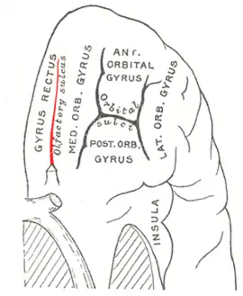 ![]() سطح المداري من الفص الجبهي الأيسر. (التلم الشمي مرئيا في أعلى اليسار.) | |