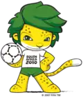 | 2010 | زاكومي | ![]() | زاكومي هو فهد وهو حيوان رمز لجنوب أفريقيا مرح ورياضي شعره أخضر. جاء تسميته من خلال التالي : زا (ZA) الرمز الكودي لجنوب أفريقيا وكومي (KUMI) كلمة تعني بلغة الجنوب الأفريقيين الرقم عشرة والذي يعود إلى سنة إقامة البطولة.[4] | |