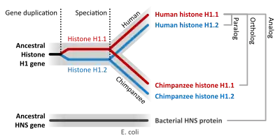في الأعلى: يتكرّر جين من الأسلاف لإنتاج اثنين من نظرائه (الجينات A وB). ينتج عن حدوث تباين أورثولوجي في النوعين الناتجين. في الأسفل: في الأنواع المنفصلة، يكون للجين غير ذي الصلة وظيفة مماثلة (الجين C) ولكن له أصل تطوّري منفصل وكذلك متناظر.