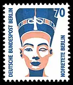 وفي عام 1989، أصبح وجه نفرتيتي على البطاقات البريدية في برلين وعلى الطوابع البريدية الألمانية.[25] وفي عام 1999، ظهر التمثال على الملصقات الانتخابية لحزب الخضر الألماني، وهو بمثابة وعد بعالم متعدد الثقافات مع شعار "امرأة برلين القوية".[43] ووفقًا لكلوديا بريجر، فهناك سبب آخر لارتباط تمثال نفرتيتي بالهوية الوطنية الألمانية، وهو المنافسة مع البريطانيين الذين اكتشفوا مقبرة توت عنخ آمون، ومن ثم حكموا مصر.[43]