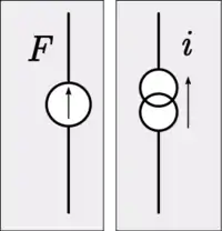 يتم تمثيل مصدر التيار الكهربي الثابت 'I' في تمثيل المعاوقة بمصدر القوة الميكانيكية الثابتة 'F'، أما مصدر الجهد الكهربي الثابت "V" فيتم تمثيله بمصدر السرعة الثابتة، بالرغم من أن مصدر الجهد الكهربي بمثابة القوة التي تدفع التيار الكهربي في المجال الكهربي، والتيار الكهربي يُعبّر عن سرعة تدفق الشحنات الكهربية، ولكن تمثيل القبولية لا يعتمد على مقدار التشابه بين المجالين ولكن يرغب فقط في الحفاظ على طوبولوجيا النظام الميكانيكي.[29]