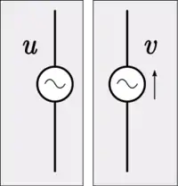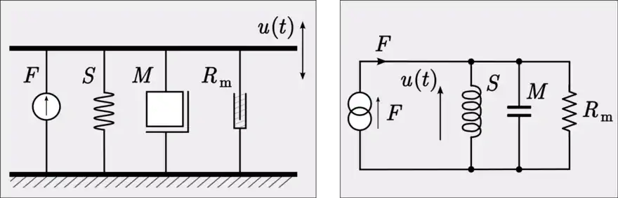 - حيث: G = 1/R هي الموصلية الكهربية، وR هي المقاومة، وv هو فرق الجهد، وi هو التيار الكهربي، وRm هي المقاومة الميكانيكية، أو التخميد، وF هي القوة، وu هي السرعة الناجمة عن القوة.