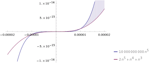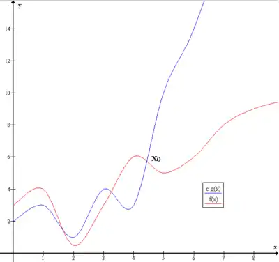 - رمز O كبير: نقول أَنَّ أو إذا كان هنالك ثابت بحيث انه يوجد ولكل يحدث التالي: اي انه إذا تخيلنا رسم الدالتين f و- g حينها نرى ان الدالة f اعلى من الدالة g ابتداء من مكان معين.