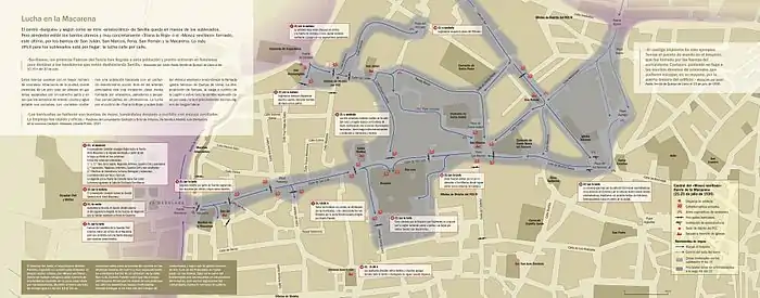 بدأ الهجوم بالقصف على بوابة ماكارينا. ففككت المدفعية الحواجز على التوالي. وبحسب كاستيون الذي قاد الهجوم عبر هذا المكان فقد تقدم الفيلق "في طابورين واحدًا تلو الآخر على جانبي الطريق، يردون بطلقات على النيران التي تأتيهم من النوافذ والشرفات. وتعرضت الحواجز بإطلاق القنابل اليدوية عليها، ثم اندفعوا جميعا باكتساح كالسكين. وبذا استولى المتمردون على حي ماكارينا وقتلوا كل شخص أمسكوا به وبيده سلاح.[78]