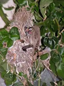 يشبه عش هذا الطير المحفظة النسائية. يكون بشكل عام طول العش 18 سم وعرضه 8 سم في القاعدة. العش مصنوع من أوراق وعشب ومواد نباتية أخرى. يربط العصفور هذه المكونات بشعر وخيوط من بيت العنكبوت، يستعمل العصفور أيضاً الريش والصوف من أجل بناء العش. تبيض الانثى من 1-3 بيضات، ويكون البيض ناعم الملمس ولامع. تكون هذه البيوض مختلفة الألوان إلى حد ما; بشكل عام تكون بيضاء أو رمادية مع نمط لوني باهت نحو طرف البيضة. تحضن الام البيوض لمدة 13 - 14 يوم. يكون للصغار ملمس ناعم وزغب ويكون لون فمها أحمر-برتقالي، تبلغ الصغار وتكون قادرة على الطيران بعد 14-21 يوم.