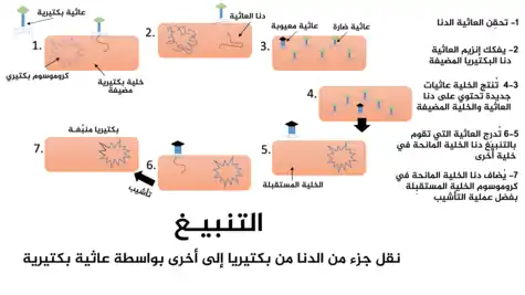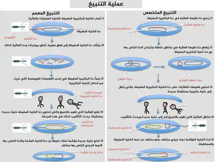 التنبيغ يحدث إما من خلال الدورة المحللة أو الدورة الاندماجية. عندما تصيب الفاجّات (الفيروسات التي تصيب البكتيريا) المحلِّلة الخلايا البكتيرية، فإنها تُسَخِّر آليّات التضاعف، النسخ، والترجمة في الخلية البكتيرية المُضيفة لإنتاج جُسيمات فيروسيّة جديدة. ثم تُحَرَّر جزيئات الفاجّ الجديد عن طريق تحلُّل المُضيف. في الدورة الاندماجية، يندمج كروموسوم الفاجّ في الكروموسوم البكتيري كطليعة عاثية, حيث يمكن أن يبقى خاملاً لفترات طويلة من الزمن. عند حَثّ طليعة العاثية(بواسطة الأشعة فوق البنفسجية على سبيل المثال), ينفصل جينوم الفاجّ عن الكروموسوم البكتيري وتبدأ الدورة المحلِّلة، والتي تبلُغ ذُروَتها في تحلّل الخلية وإطلاق جزيئات الفاجّ. يحدث التنبيغ المُعَمَّم في كلتا الدورتين خلال المرحلة المحللة(انظر أدناه)، بينما يحدث التنبيغ المخصَّص عندما تنفصل طليعة العاثية في الدورة الاندماجية(انظر أدناه).