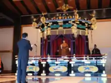 انتقل الإمبراطور الجديد إلى الكرسي، حيث تم وضع كل من كوساناغي وياساكاني نو ماغاتاما وخاتم الملكية وختم الدولة على حوامل بجانبه. تم تقديم صولجان خشبي بسيط للإمبراطور، الذي واجه رئيس وزرائه الواقف في فناء مجاور، ممثلا الشعب الياباني. قدم الإمبراطور خطابًا أعلن فيه اعتلاءه للعرش، داعيًا رعاياه إلى مساعدته بعقلية متحدة في تحقيق كل تطلعاته. أجاب رئيس وزرائه بخطاب واعدا بالإخلاص والتفاني، تلاه " ثلاثة هتافات من بانزاي " من جميع الحاضرين. تمت مزامنة توقيت هذا الحدث الأخير بدقة، بحيث يمكن لليابانيين في جميع أنحاء العالم الانضمام إلى صيحة "بانزاي" في اللحظة التي يتم تقديمها في كيوتو أو طوكيو في نفس اللحظة بالتحديد. [2]