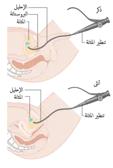 ![]() مُخطط توضيحي يُظهر تنظير المثانة عند الذَكر والأنثى | |