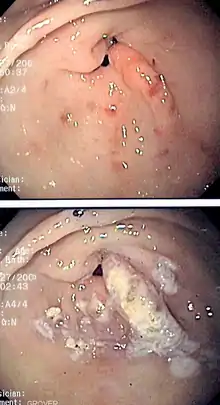 - العدوى: قد تكون أكثر شيوعاً مما كان يُعتقد سابقاً، أظهرت دراسة قام بها وانج (Wang) وزملاؤه أن معدل العدوى بعد التنظير الهضمي العلوي كان 3 لكل 1000 إجراء تنظيري.[18]