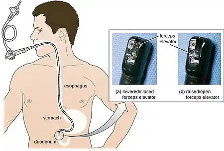 - التداخل العلاجي (على سبيل المثال، استخراج الأجسام الغريبة، السيطرة على النزف، توسيع أو وضع دعامة لتضيق، استئصال الأورام، أو فغر المعدة).