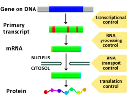 يمكن التحكم في أي مرحلة من التعبير الجيني، من نسخ الدنا إلى رنا إلى تعديل ما بعد الترجمة للبروتين. هذه قائمة بالمراحل التي يتم فيها تنظيم التعبير الجيني، والمرحلة التي يتم فيها التنظيم بشكل كبير جدا هي بدء الترجمة: