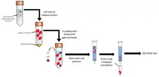 تتضمن التقنية الشائعة هندسة سلسلة من 6 إلى 8 هيستيدينات (histidines) إلى البوابة N- أو C- من البروتين. يرتبط البولي-هيستيدين بقوة مع أيونات المعادن ثنائية التكافؤ كالنيكل والكوبالت. يمكن تمرير البروتين خلال عمود يحوي أيونات نيكل غير متحركة والتي ترتبط بوسم البولي-هيستيدين. تمر كل البروتينات غير الموسومة خلال العمود. يمكن استخلاص البروتين باستخدام الإِيميدازول، والذي ينافس وسم البولي-هيستيدين بالارتباط بالعمود، أو عن طريق إنقاص pH (عادة إلى 4.5)، مما يقلل من انجذابية الوسم للراتنج. تستخدم هذه الإجرائية لتنقية البروتينات المأشوبة مع وسم انجذاب مُهندَس (مثل 6xHis أو Clontech's HAT)، كما يمكن أن تستخدم للبروتينات الطبيعية ذات الانجذاب الطبيعي إلى الكاتيونات ثنائية التكافؤ.