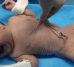 يتميز الجلد في هذه الحالة بانه -مترهل وفضفاض. - الكثرة في التجاعيد. -جلد غير مرن. -الشيخوخة المبكرة. - المناطق المتضررة من الجلد قد تكون سميكة وداكنة. -مفاصل فضفاضة (فرط المرونة) بسبب التراخي الرباط ق والوتر . وعندما يكون التهدل شديد في الجلد يمكن أن يؤثر أيضا على الأعضاء الداخلية و . الرئة والقلب (تضيق الرئوي فوق الصمام)، الأمعاء ، أو الشرايين وقد يتعرض المريض بجموعة متنوعة من الإعاقات الحادة. مثل، الفتق وتجيب خارجي في المثانة يمكن ملاحظتها أيضا. الإصابة بالصلبة الزرقاء.