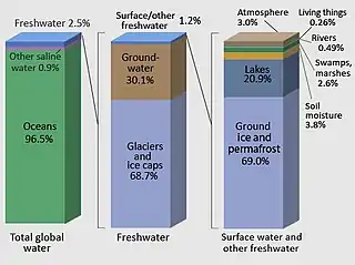 يقدر إجمالي حجم المياه على الأرض في 1386000000 كيلومتر مكعب من (333 مليون ميل مكعب)، مع 97.5٪ هي المياه المالحة و 2.5٪ هي المياه العذبة. من المياه العذبة 0.3٪ فقط هي في شكل سائل على السطح.[4][5]