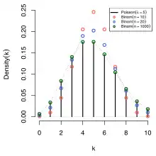 توزيع بواسون هو أيضًا حد التوزيع ذي الحدين، حيث يساوي احتمال النجاح لكل تجربة λ مقسومًا على عدد التجارب، حيث يقترب عدد التجارب من اللانهاية (انظر التوزيعات ذات الصلة ).