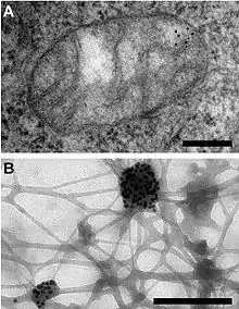 متقدرة. (B) وحدات mtDNA معلمة بجسيمات الذهب بعد الاستخلاص.[1]