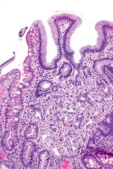 ![]() صورة مجهرية تُظهر خزعة إثنا عشرية مع توضع معوي مغاير، وهي مصبوغة بصبغة الهيماتوكسيلين واليوزين. صورة مجهرية تُظهر خزعة إثنا عشرية مع توضع معوي مغاير، وهي مصبوغة بصبغة الهيماتوكسيلين واليوزين. | |