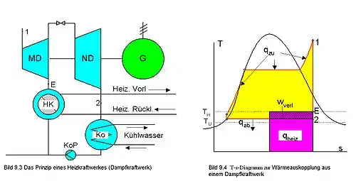 ويوضح الرسم البياني على اليمين العلاقة بين درجة الحرارة T و الإنتروبية S ، وذلك في حالة تشغيل التعشيقة بحيث تنتج 50 % من طاقتها الكهرباء و 50 % ماء ساخن . تعطينا المساحة الصفراء كمية الحرارة التي تتحول إلى كهرباء . وتعطينا المساحة الحمراء في الرسم البياني كمية الحرارة المستغلة للماء الساخن، كما يبين الجزء الأعلى من ذلك المربع (البني اللون ) الجزء الصغير المفقود من الكهرباء بسبب السحب الجزئي للبخار قبل توربين الضغط المنخفض ND.
