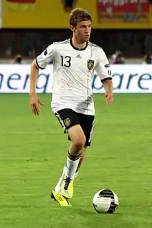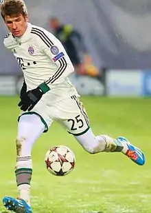 توماس مولر[5] (تلفظ ألماني: [ˈtoːmas ˈmʏlɐ]؛ مواليد 13 سبتمبر 1989) هو لاعب كرة قدم ألماني يلعب في مركز صانع الألعاب والهجوم مع نادي بايرن ميونخ ومنتخب ألمانيا لكرة القدم.[6][7] يعد مولر لاعب متعدد الاستخدامات، حيث يلعب كلاعب خط وسط أو مهاجم، وقد لعب في مجموعة متنوعة من الأدوار الهجومية – كلاعب خط وسط مهاجم، مهاجم ثان، رأس حربة وعلى أي من الجناحين. لقد تم الإشادة به على تمركزه وعمله الجماعي ولياقته العالية ومعدل ركضه وتوازنه ما بين التسجيل صناعة الأهداف.[8] كما يُنظر إليه على نطاق واسع على أنه أحد أفضل اللاعبين الذين يلعبون بدون الكرة على الإطلاق بسبب وعيه بالتمركز.[9] نظرًا لنقاط القوة العديدة في لعبه، يُنظر إليه على نطاق واسع على أنه أحد أكثر اللاعبين المهاجمين اكتمالاً في اللعبة.[10]