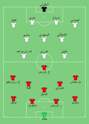 | 1 | أسامة حدادي، حمزة الأحمر، عبد القادر الوسلاتي، أحمد العكايشي، زياد الدربالي، رامي الجريدي، عصام بن خميس، أيمن الطرابلسي |