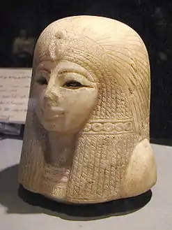 - أما غطاء الآنية الكانوبية المرمري المنحوت على شكل رأسها ففي متحف الأقصر الآن.[4]
