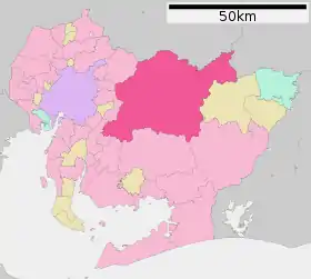 | آيساي | أما | أنجو | تشيريو | تشيتا | غاماغوري | هاندا | هيكينان | إيتشينوميا | إنازاوا | إنوياما | إواكورا | كارييا | كاسوغاي | كيتاناغويا | كيوسو | كوماكي | كونان | ميوشي | ناغاكوت | ناغويا (العاصمة) | نيشيو | نيشين | أوكازاكي | أوبو| أواري أساهي | سيتو | شينشيرو | تاهارا | تاكاهاما | توكونامه | توكاي | تويو أكه | تويوهاشي | تويوكاوا | تويوتا | تسوشيما | ياتومي | |||