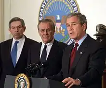 خلال خطاب بوش في الاتحاد في يناير 2002، وصف كلا من العراق وإيران وكوريا الشمالية كدول "تشكل محور الشر" و "تشكل خطرا خطيرا ومتزايدا". اقترح بوش إمكانية الحرب الوقائية: "لن ننتظر الأحداث، في حين أن المخاطر تتجمع. لن أقف مكتوفي الأيدي، فالخطر يقترب أكثر فأكثر.ولن تسمح الولايات المتحدة الأمريكية بأخطر الأنظمة في العالم بتهديدنا بأسلحة العالم الأكثر تدميرا ".[61][62]