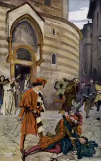 في فصل المسرحية الأول، وفي المشهد الأول، يدخل تيبالت ويساعد خدمه، سامبسون وغريغوري، الذين كانوا يتقاتلون في الشارع مع خدم مونتاج وأبراهام وبالثاسار. وعند رؤيتة لبنفوليو (ابن عم روميو) وهو يحاول ايقاف القتال، أشهر تيبالت سيفه ليقاتله، قائلا: ما هذا، تتحدث عن السلام؟ أنا أكره هذه الكلمة كما أكره الجحيم، وكل من ينتمون لحزب مونتاج، وثي. وفي وقت لاحق، في الحفل الراقص بقصر كابوليت، كانت أول مرة يتعرف فيها تيبالت على روميو من خلال تمويهه وتنكره، وذكر انه سيقتله إذا لم يمنعه عمه اللورد كابوليه عن ذلك. بعد ذلك أرسل تيبالت رسالة إلى روميو ليتحداه في مبارزة حتى الموت. وفي الفصل الثالث يدخل تيبالت للبحث عن روميو، فقط ليتشاجر ويثير غضب ماركيشيو ، الذي كان يسخر من تيبالت قبل أن يدخل المشهد. في بداية المشهد يتجاهل تيبالت ماركيشيو ويواجه روميو، الذي يرفض القتال بسبب زواجه من جولييت. مما زاد من غضب تيبالت أكثر. في حين انه لا يعرف أن روميو لا يستطيع محاربته لأنهم الآن أقرباء. بعد ذلك يفقد ماركيشيو أعصابه ويبدأ في القتال مع تيبالت. حاول روميو وقف القتال عن طريق الإسراع في التدخل بينهما، ولكن دون جدوى حيث طعن تيبالت ماركيشيو وسقط قتيلاً بين ذراعي روميو. غضب روميو وحزن حزناً شديداً على صديقه، مما دفعه إلى قتل تيبالت، مما أدى إلى نفيه بعد ذلك من قبل الأمير. ذُكر بعد ذلك ان تيبالت هو أول ابن عم لجولييت، وذلك عندما ظهرت السيدة كابوليت في المشهد الذي توفى فيه تيبالت حيث ظلت تصرخ وتنادي باسمه حزناً عليه.