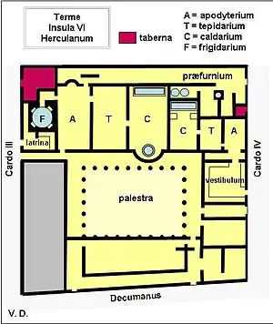 مخطط حمّامات هركولانيوم الرومانيّة، ويظهر التيبيداريوم بالمنطقة (T).