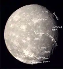|CitationClass=تم تجاهله (مساعدة) - Croft, S.K. (1989). New geological maps of Uranian satellites Titania, Oberon, Umbriel and Miranda. Proceeding of Lunar and Planetary Sciences. 20. Lunar and Planetary Sciences Institute, Houston. صفحة 205C. مؤرشف من الأصل في 03 مايو 2019. الوسيط