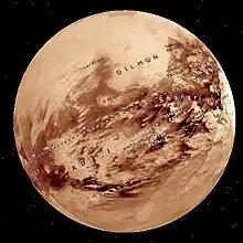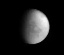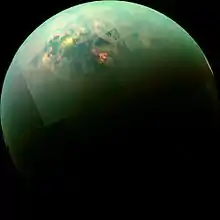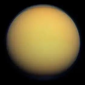 ![]() تيتان باللون الطبيعي. الغلاف الجوي السميك ذو لون برتقالي بسبب غبش النيتروجين العضوي الكثيف. | |||||