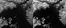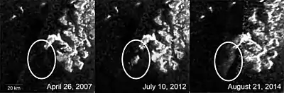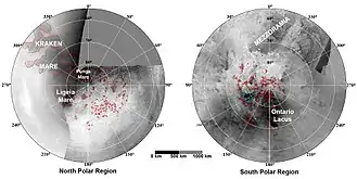 | صور متباينة لعددٍ من البحيرات في نصف تيتان الشمالي (يسار) ونصفه الجنوبي (يمين). | صورتان لنصف تيتان الجنوبي تفصل بينهما سنة واحدة، تُظهران التغييرات في البحيرات القطبية الجنوبية. |