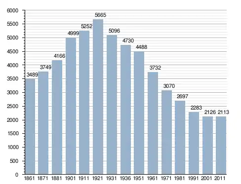 في سنة 1861 بلغ عدد السكان 3٬489 نسمة، وتطور العدد ليصل في سنة 2011 لـ 2٬113 نسمة.
