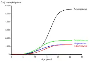كما سمح علم الأنسجة كذلك بتحديد أعمار عينات أخرى، يمكن تطوير منحنيات النمو حين يتم وضع أعمار مختلف العينات في منحنى بياني مع كُتلها. شكل منحى نمو التيرانوصور يشبه حرف S، حين يكون صغيرًا فوزنه أقل من 1,800 كـغ (4,000 رطل) حتى يبلغ سن الـ14 تقريبًا، حيث يبدأ حجم الجسم بالزيادة بشكل كبير. وخلال مرحلة النمو السريع هذه، يزداد حجم التيرانوصور الصغير بمتوسط 600 كـغ (1,300 رطل) سنويًا وهذا في خلال الأعوام الأربعة التالية. وفي سن الـ18 يستقر المنحى مجددًا، مما يشير إلى تباطؤ النمو بشكل كبير. وعلى سبيل المثال لا يفصل عينة سو ذات الـ28 عامًا عن العينة الكندية (RTMP 81.12.1) ذات الـ22 عامًا سوى 600 كـغ (1,300 رطل).[15] وقد أكّدت دراسة نسيجية أجريت سنة 2004 بواسطة باحثين مختلفين صحة هذه النتائج، حيث وجدت أن النمو السريع يبدأ بالتباطؤ في سن السادسة عشر.[83]
