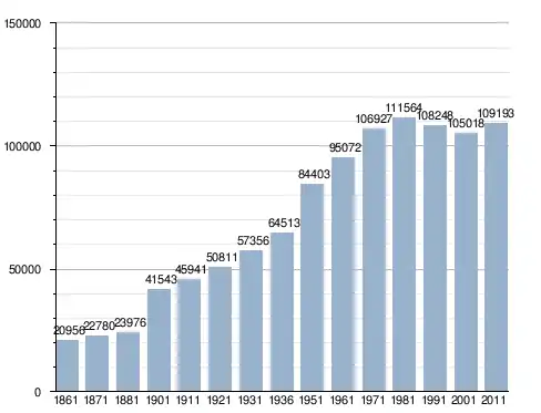 في سنة 1861 بلغ عدد السكان 20٬956 نسمة، وتطور العدد ليصل في سنة 2011 لـ 109٬193 نسمة.