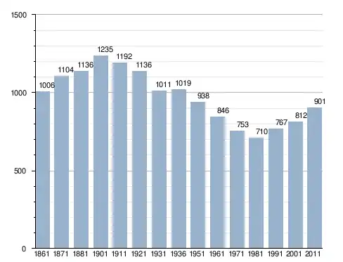 في سنة 1861 بلغ عدد السكان 1٬006 نسمة، وتطور العدد ليصل في سنة 2011 لـ 901 نسمة.