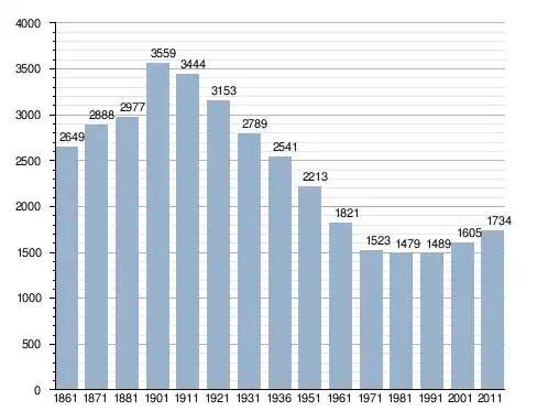 في سنة 1861 بلغ عدد السكان 2٬649 نسمة، وتطور العدد ليصل في سنة 2011 لـ 1٬734 نسمة.