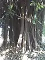 A huge Ficus elastica tree in Ghana showing the aerial roots.