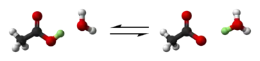 وينشأ سريعا توازن في هذا التفاعل. وهنا يستطيع كل من HA و H3O+ إعطاء بروتون إلى شريك ثالث في التفاعل ، ولهذا نعتبر كل منهما حمضا. أما H2O و A− فيمكنهما اكتساب بروتون ، ولذلك نسميهما قاعدتين. وعندما نفترض اهمال الماء و H3O+ يتبقى HA و A−. ونظرا لأن التوازن في هذا التفاعل معتمدا على التركيز ، فتعتمد قوة HA لأن تكون حمضية على قوة A−, أن يكون قاعديا.