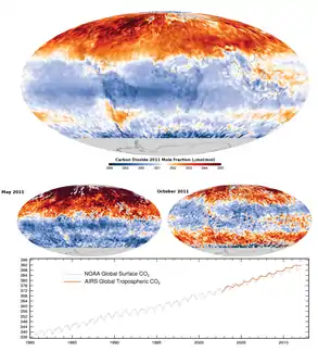 تباينت تركيزات ثاني أكسيد الكربون في دورات تكرارية عِدَّة تبدأ من حوالي 180 جزءًا في المليون في ذروة العصر الجليدي بالهولوسين والبليستوسين إلى 280 جزءًا في المليون خلال الفترات الفاصلة بين العصور الجليدية. ومنذ بداية الثورة الصناعية، زاد تركيز ثاني أكسيد الكربون في الغلاف الجوي إلى أكثر من 400 جزء في المليون وما زال في زيادة، مما تسبب في ظاهرة الاحترار العالمي (الاحتباس الحراري).[7] وتشير دراسات أجراها مرصد ماونا لوا إلى تجاوز متوسط تركيز ثاني أكسيد الكربون يومياً في الغلاف الجوي 400 جزء في المليون (في 10 مايو 2013)، وإلى تجاوز متوسط ثاني أكسيد الكربون شهرياً في 413 جزءًا في المليون اعتبارًا من أبريل 2019،[8][9][10] والواقع أن تركيز ثاني أكسيد الكربون وصل هذا المستوى في القطب الشمالي منذ شهر يونيو 2012.[11] وولو جمعنا كُلُّ جزءٍ في المليون من ثاني أكسيد الكربون بالغلاف الجويّ لحصلنا على 2.13 جيجا طن من الكربون، أو 7.82 جيجا طن من ثاني أكسيد الكربون،[12] واعتبارًا من عام 2018 أمسى حجمُ ثاني أكسيد الكربون من غلاف الأرض الجوي حوالي 0.041% (أي ما يساوي 410 جزء في المليون)،[3][3][13][14][15] وهو ما يعادل حوالي 3210 جيجا طن من ثاني أكسيد الكربون، ويحتوي تقريبًا على 875 جيجا طن من كربون.